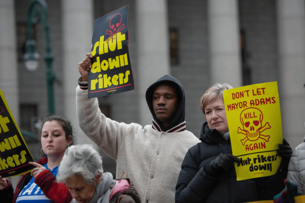 Close-Rikers advocates rally ahead of a Board of Correction meeting in Lower Manhattan, Jan. 10, 2024. Credit: Ben Fractenberg/THE CITY
