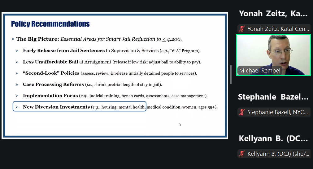 During the webinar, Kellyann Block and Mike Rempel from DCJ provided updated data on the nature and scale of mental health needs among people detained at Rikers. They also went over the key policy recommendations, including a 15-point plan to strengthen community treatment and reduce unnecessary detention.
