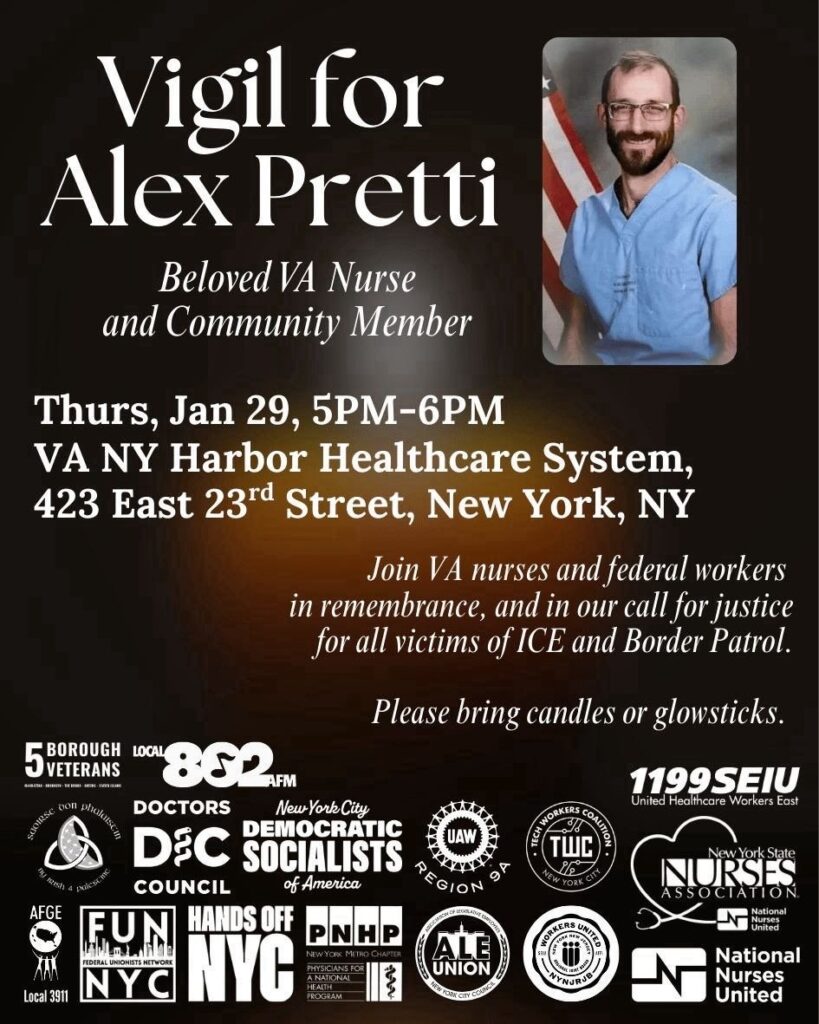 Everyday people on the ground in Minnesota are continuing to fight back against the expanding occupation and escalating ICE violence. In solidarity with Minneapolis, we’re joining VA nurses and federal workers tonight, Thursday, January 29th, at 5 pm at the Manhattan VA hospital for a candlelight vigil for Alex.